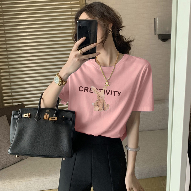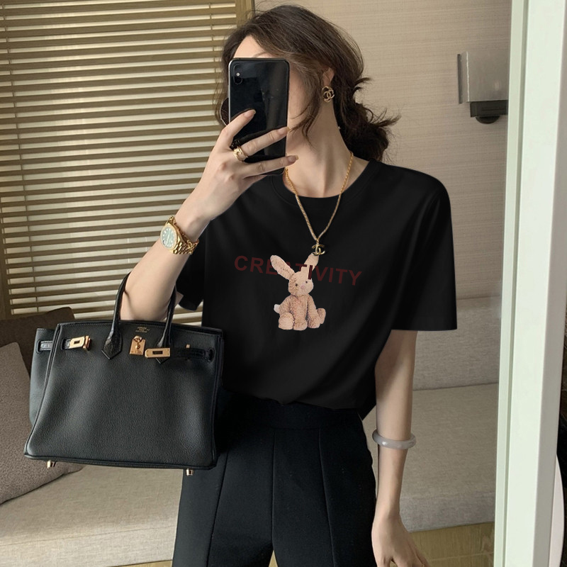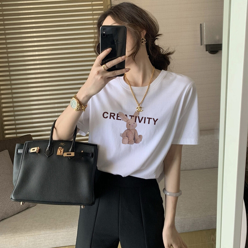 白色天丝短袖t恤女夏季高级感小众设计冰丝半袖时尚卡通印花体恤